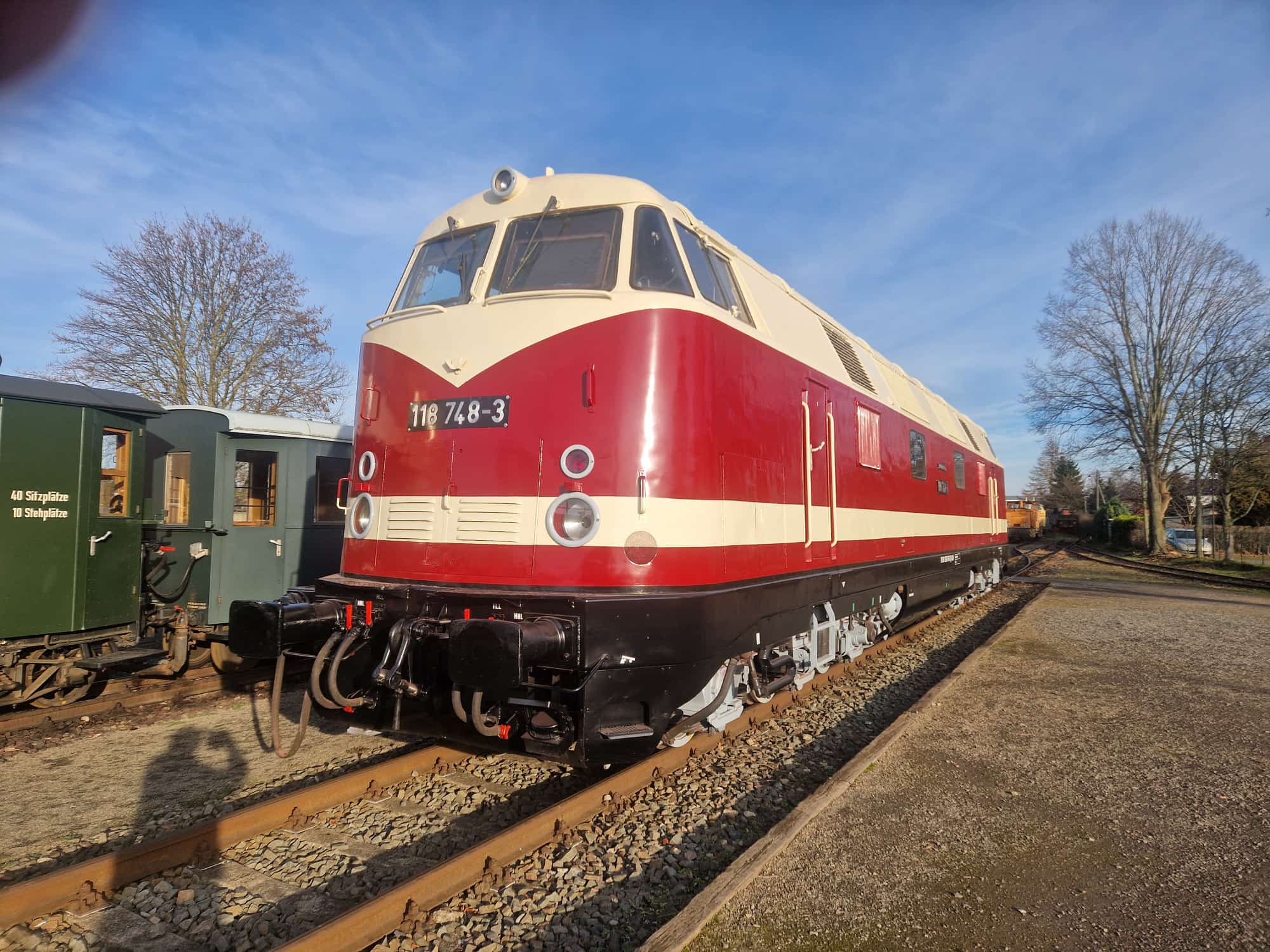 schon wieder ist ein Jahr vergangen und wir steuern auf Weihnachten und den Jahreswechsel zu. Natürlich denkt man dabei auch an Geschenke. Das tun wir auch. So freuen wir uns besonders über unser größtes Weihnachtsgeschenk dieses Jahr. Unsere Diesellok 118 748 ist nun wieder betriebsfähig. Ein paar Worte zu der Lok: Sie wurde 1968 bei beim VEB Lokomotivbau Karl Marx in Potsdam-Babelsberg gebaut, verfügt über zwei Dieselmotoren mit je 1.200 PS und darf maximal 120 km/h schnell fahren. Damit ist sie eine Universallok, die sowohl im Personen- als auch im Güterverkehr eingesetzt wurde. Nach ihrer Abstellung durch die Deutsche Bahn AG im Jahr 1999 wurde sie an die Mitteldeutsche Eisenbahn verkauft, die sie in 2020 an die Firma PRESS weitergab. Seitdem bereichert sie unsere Fahrzeugsammlung, bisher allerdings nur als funktionsfähiges Ausstellungsobjekt ohne Streckenzulassung. Im Jahr 2023 erwarb ein Mitglied unseres Vereins die Lok. In den letzten Monaten wurde sie grundlegend bei der Firma Malowa in Klostermansfeld am Ostrand des Harzes aufgearbeitet. Im Rahmen der Arbeiten wurden unter anderem die Motoren, Drehgestelle, Achsen und Bremsen instandgesetzt. Außerdem erhielt sie eine zeitgemäße Zugsicherungs- und Funkanlage, um sie auch für einen Einsatz auf Strecken der Deutschen Bahn AG zu ertüchtigen. Nach Abschluss der technischen Arbeiten hat sie in den letzten Tagen eine neue Lackierung erhalten hat und erstrahlt jetzt wieder im alten Glanz in rot/weißer Farbgebung. Die ersten beiden Fotos zeigen sie vor einigen Tagen noch in der Lackierhalle einer bekannten Eisenbahnwerkstatt in Klostermansfeld. Keine Angst, die schwarzen Streifen, die im Lack der Lok zu erkennen sind, reflektieren nur die Umgebung.